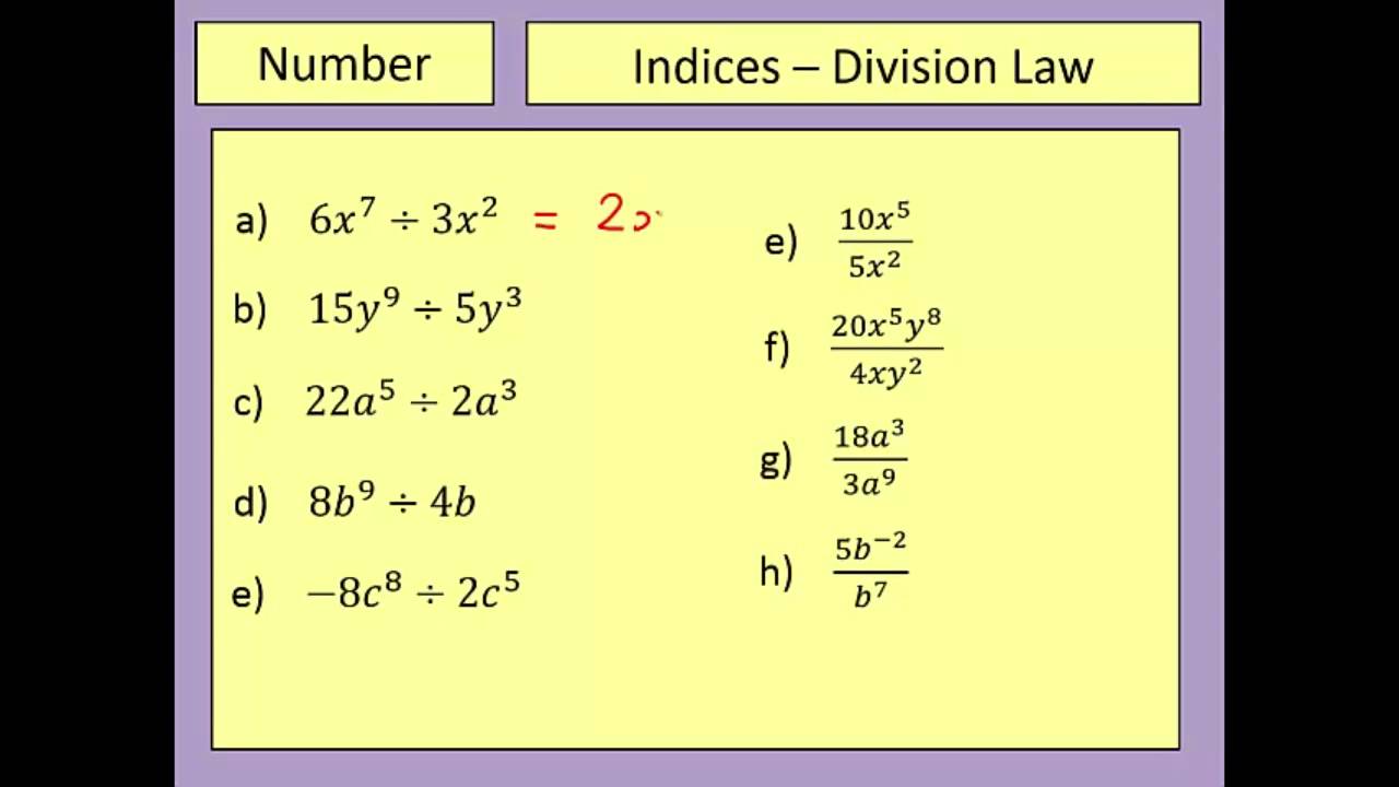 In this video going to look at the division law for indices previously we looked at the multiplication law of indices, where we realize that when you multiply these together, you would add the powers when you divide, then you subtract the powers so a to the power 6 divided by a to the power … Ler mais